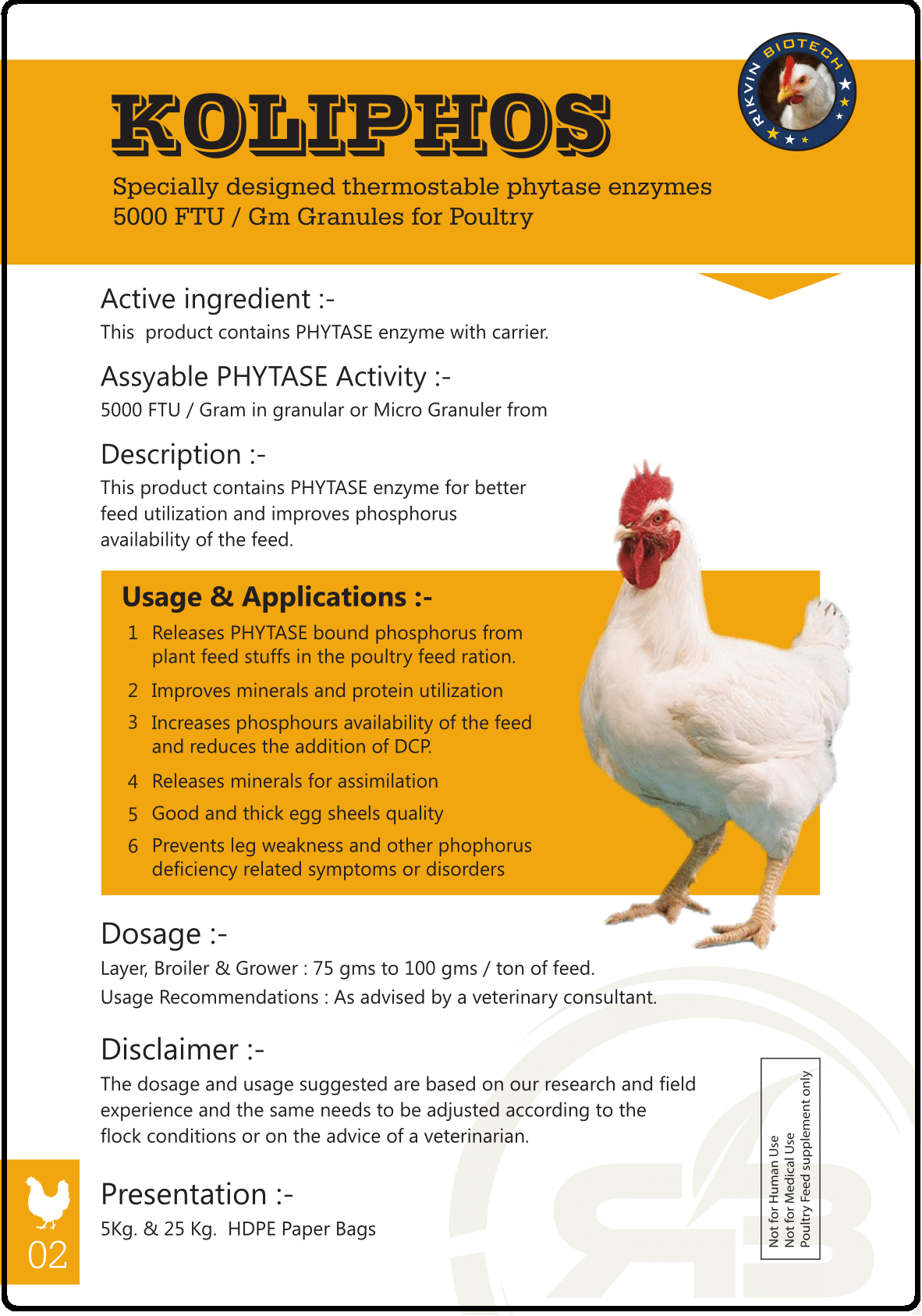 Releases PHYTASE bound phosphorus from plant feed stuffs in the poultry feed ration. Improves minerals and protein utilization. Increases phosphours availability of the feed and reduces the addition of DCP Releases minerals for assimilation. Good and thick egg sheels quality Prevents leg weakness and other phophorus deficiency related symptoms or disorders