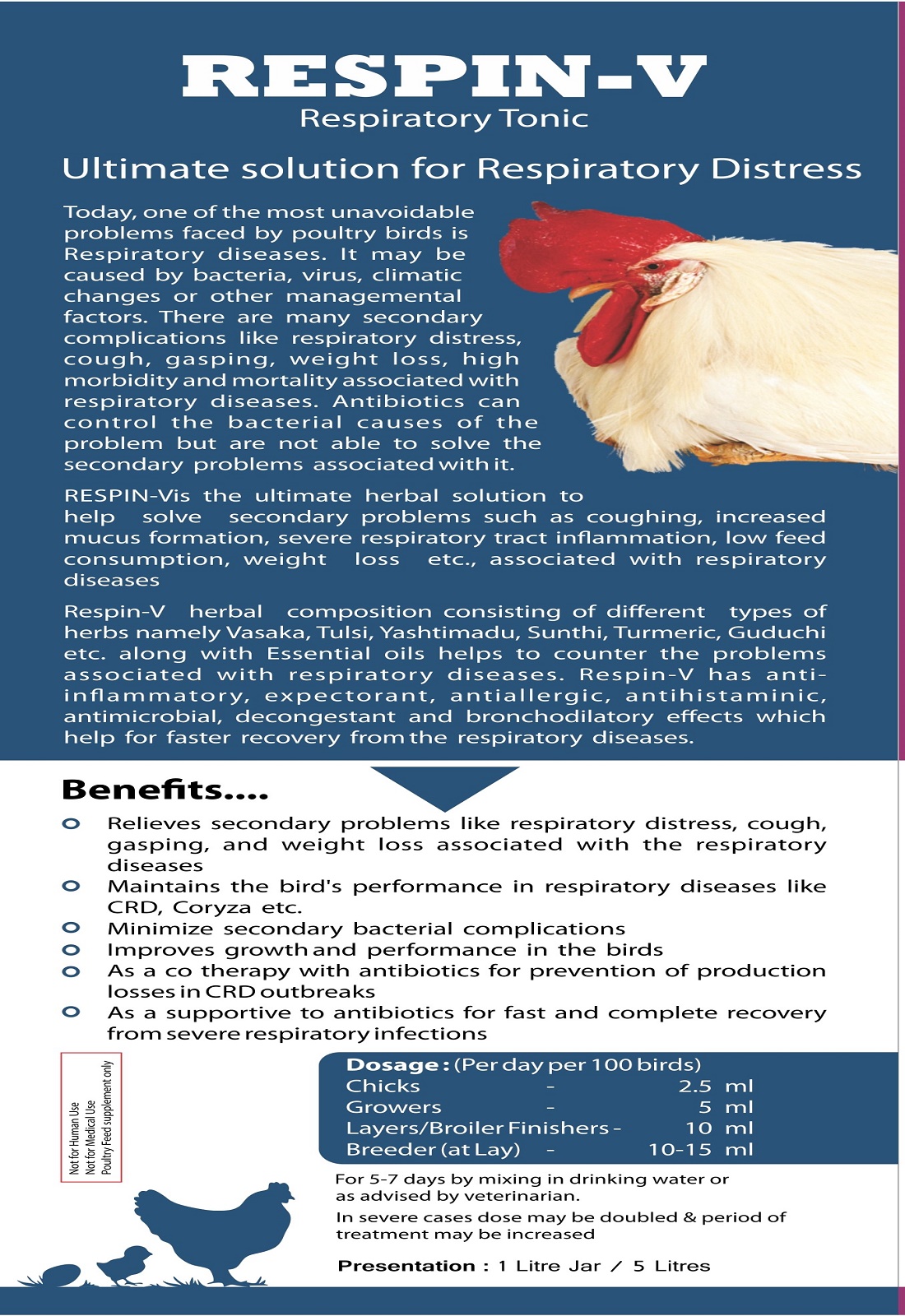 RESPIN-V is the ultimate herbal solution to help solve secondary problems such as coughing increased mucus formation, severe respiratory tract inflammation, low feed consumption, weight loss etc., associated with Respiratory diseases.